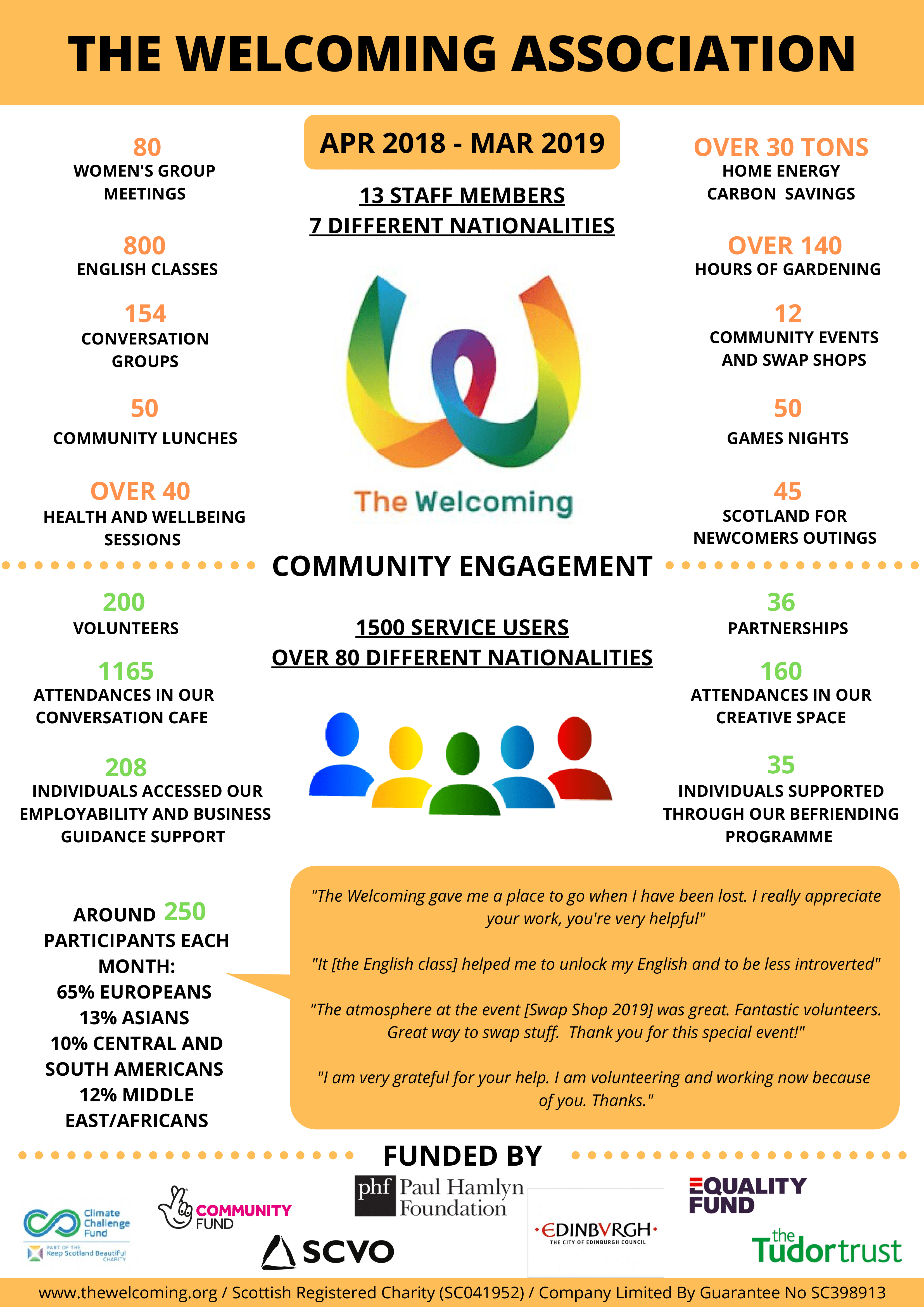 The Welcoming was started in 1999 by the Adult Learning Project Association (ALP) and supported by the City of Edinburgh Council’s Community Learning and Development workers. It initially delivered a social and cultural integration programme to the most marginalised and isolated asylum seekers in Edinburgh.