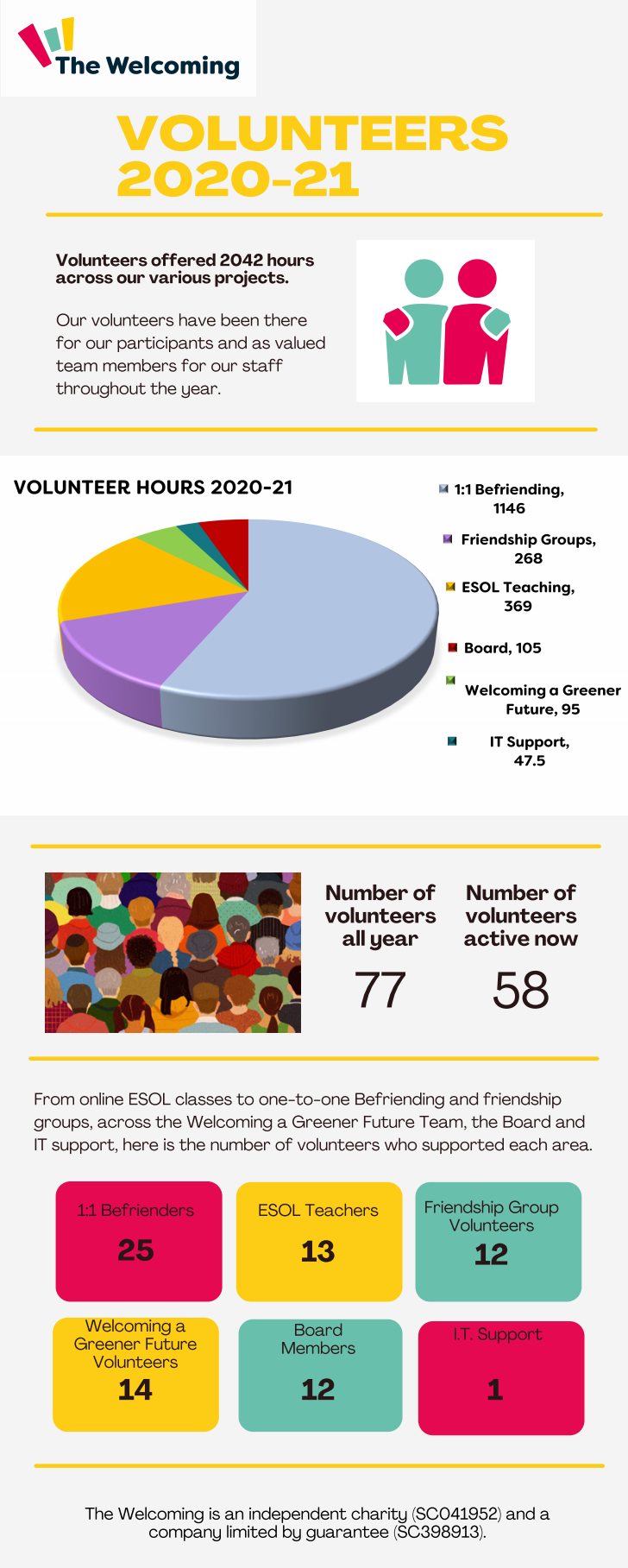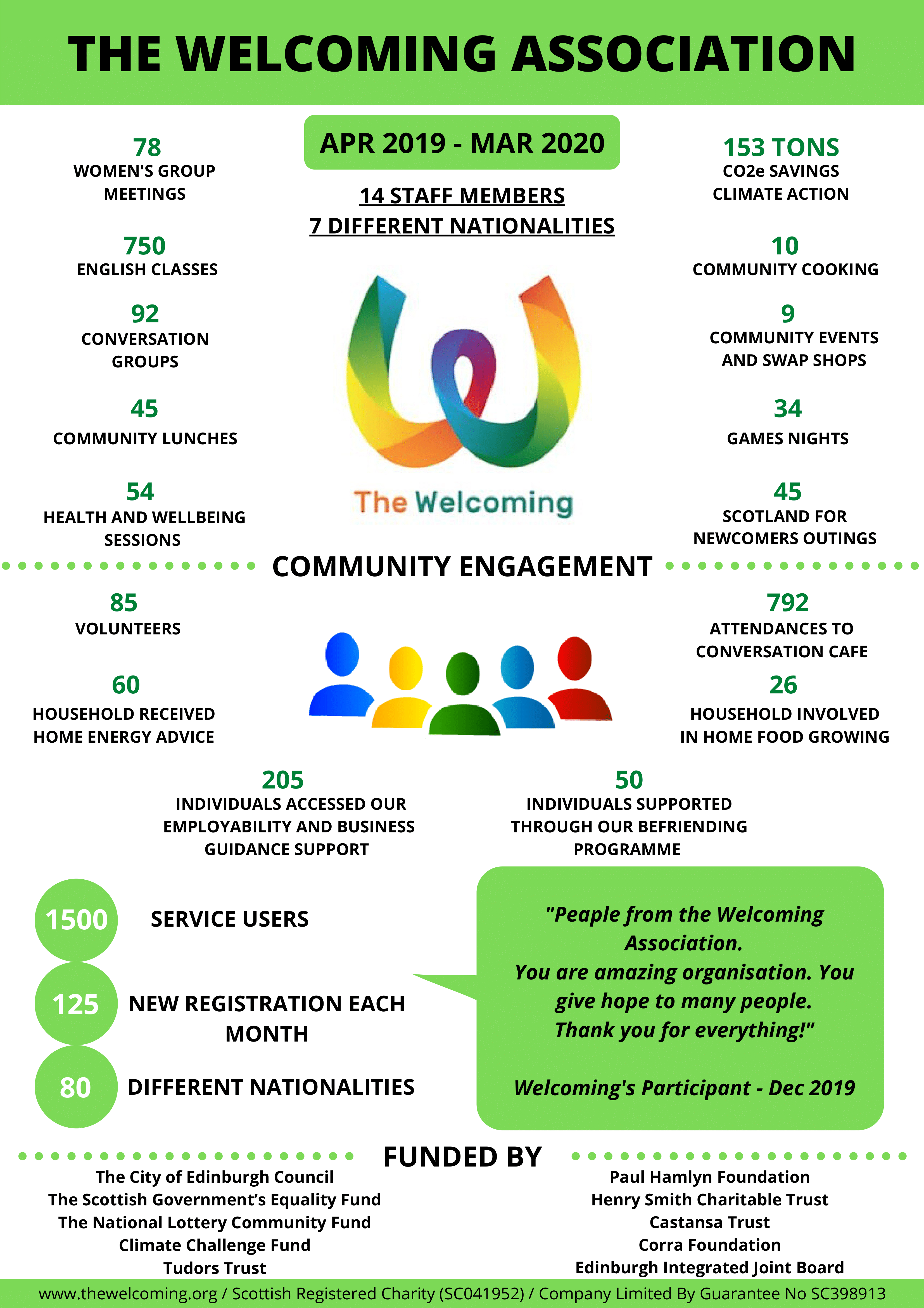 In April 2011, The Welcoming became an independent association, and a registered charity (SC041952) and company limited by guarantee (SC398913).